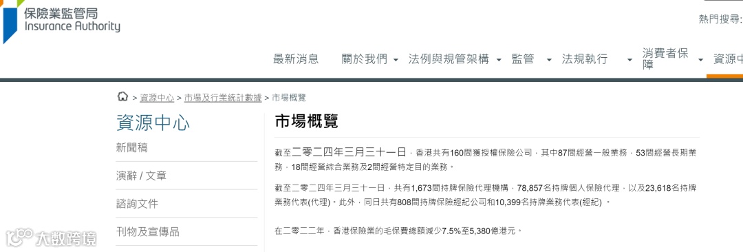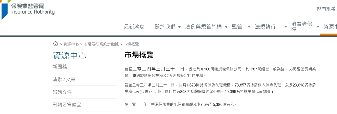 据香港保监局数据,截至2024年3月31日,香港大约有160家保险公司/10万保险代理人,以及808家保险经纪公司/1万保险经纪人。