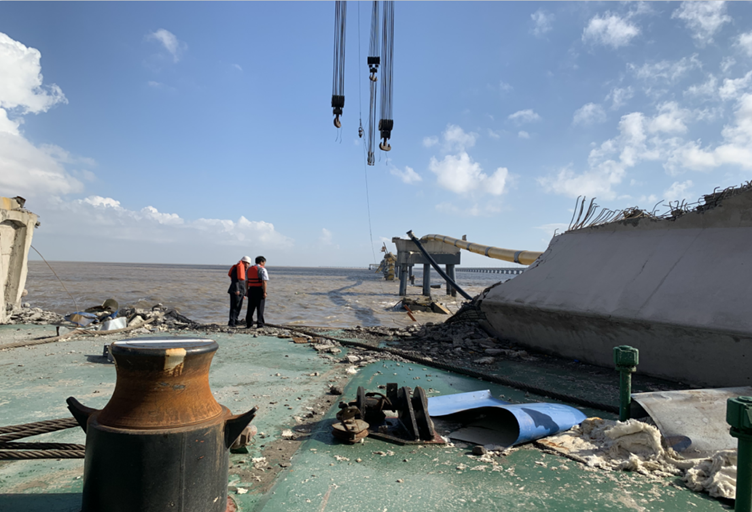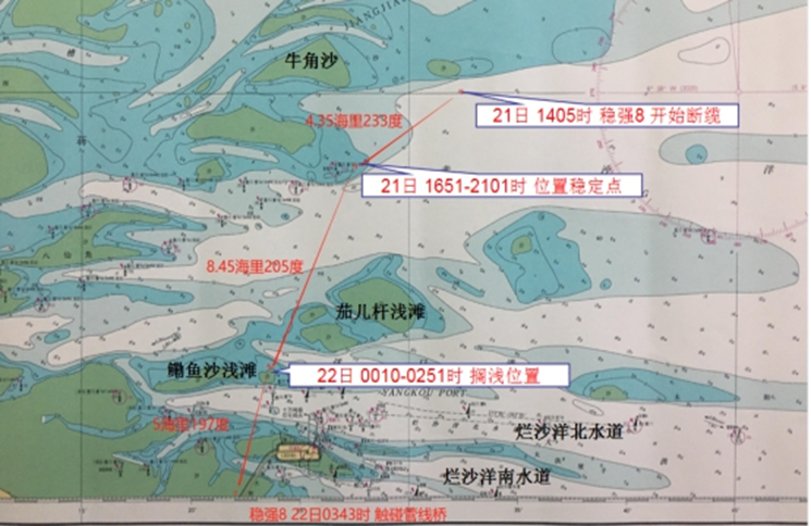 2019年9月22日,无自航能力起重船“W”轮在海上风电场某桩基附近海域锚泊防台期间发生走锚事故,长时间漂航后触碰某港区管线桥,造成船舶本身、管线桥及所载管线受损。