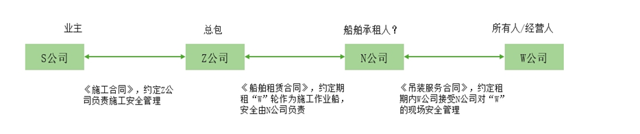 经海事局《调查结论书》认定,“W”轮未及时撤离避风、锚泊抗台措施不当导致锚钢索断裂走锚为事故直接原因,“W”轮安全管理不到位为间接原因,就此对业主S公司、承包方Z公司、N公司(船舶承租人或分包存有争议)、船舶所有人及经营人W公司提出安全管理建议。所涉各方法律关系如下: