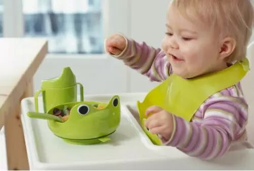 其次,当小宝开始添加辅食的同时,餐具也在发生变化。由奶瓶改变为勺子、碗,此时是锻炼小宝进食自理能力的黄金期,而在喂养中辣妈、宝爸与小宝的相互影响会促进小宝智力及情绪发育。 也就是说小宝今后的就餐习惯就是从此时开始养成的。辣妈应提供适合婴儿的餐具和多样化的辅食,尽量让小宝参与到“吃饭”这件事当中。不要以“孩子太小、吃不了”等理由一味地全权代理,也不要因为“吃得太慢、弄得全身都是”而责怪孩子。从添加辅食起,即应该训练小宝用勺子进食;7~8个月学习用杯子喝奶和水;9~10个月小宝有了主动进食的要求,可以先让他用手抓取食物,促进眼、手协调动作,并利于手部肌肉发育,同时也可使小宝的独立性、自主性得到发展。如果小宝不能有效参与“吃饭”这件事,不仅会影响将来的就餐习惯,还会因为参与感不强对吃饭兴趣缺缺,从而厌食。