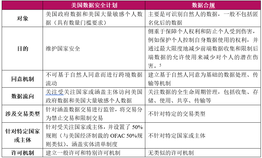 总体而言,美国数据安全计划与一般的数据合规具有以下的不同: