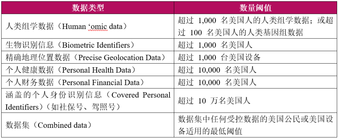 根据美国数据安全计划的最终规则,大量美国敏感个人数据是指与美国人有关的任何格式的敏感个人数据的集合或数据集,无论该数据是否经过匿名化、假名化、去标识化或加密,只要该数据达到或超过规定的阈值。具体而言,大量美国敏感个人数据是指在过去 12 个月内的任何时间点达到或超过以下阈值的任何数量的敏感个人数据,无论是通过单个或多个涵盖数据交易汇总而成: