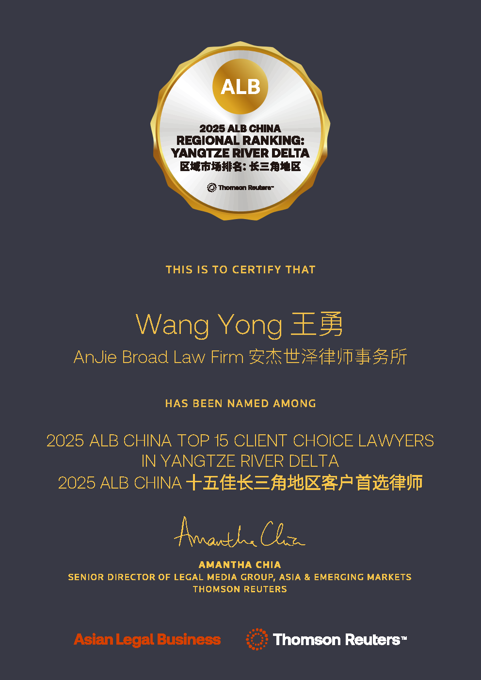 安杰世泽律师事务所合伙人王勇律师凭借在长三角地区优秀的业务实力和突出的市场评价,荣登“长三角地区客户首选律师(Client Choice)”榜单。