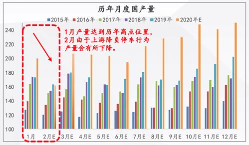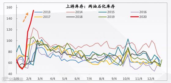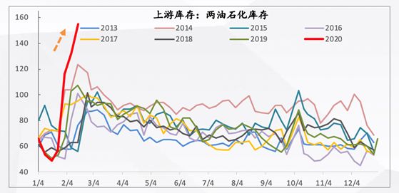 上游库存压力下降负停车,2020年1月份新产能浙石化、恒力二期陆续开车,加之检修较少,产量达到了历年高点位置200.07万吨,同比增长12%。而2月份由于上游高库存下目前较多降负以及停车行为,降负损失量约为25.88万吨以及检修损失量24.11万吨,总共供应端损失量约在49万吨。