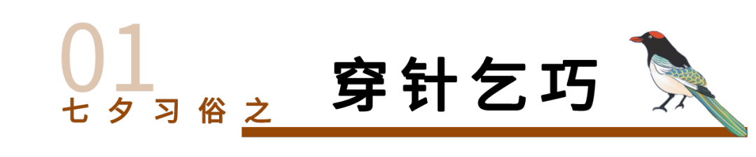 穿针乞巧是最早的乞巧方式,始于汉,流于后世。指的是在七夕这天,女子要比赛结彩线,穿七孔针。谁穿得越快,就意味着谁乞到的巧越多。