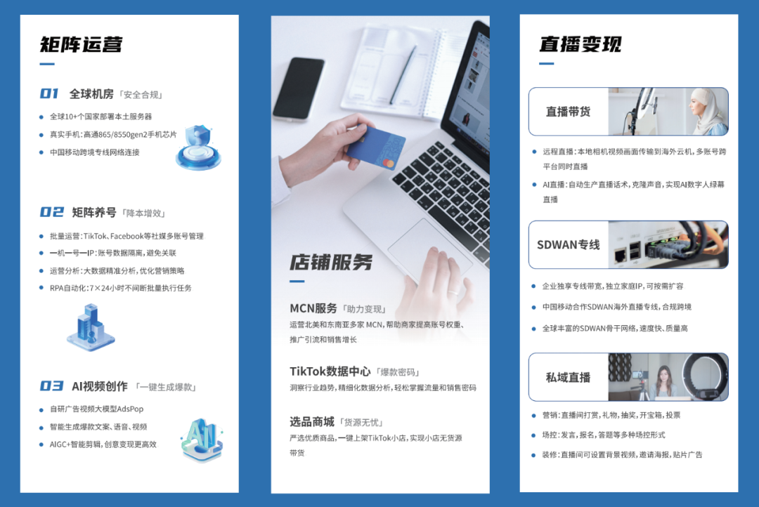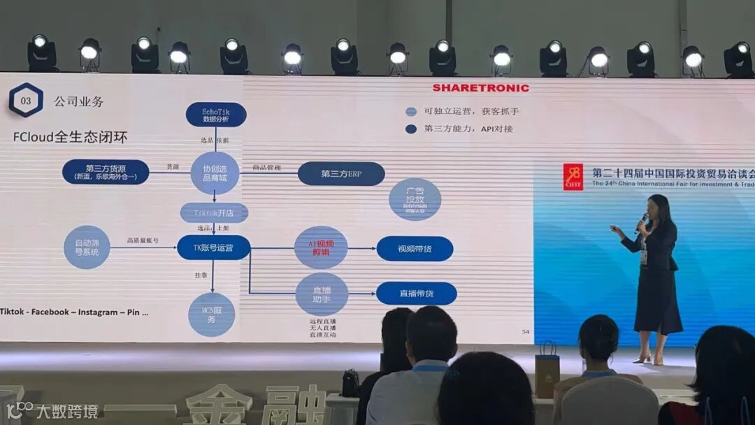 洽谈会现场,协创数据董事会办公室甘杏,还向与会嘉宾分享了协创数据业务经营情况及全球化产业的核心竞争力与成果,提到了FCloud全生态闭环产业布局,依托FCloud云手机SaaS营销系统,链接第三方货源、选品数据分析、商品管理ERP、MCN机构服务等合作,为跨境出海商家全球业务拓展提供全链路解决方案。