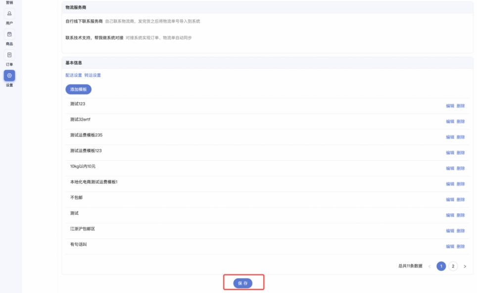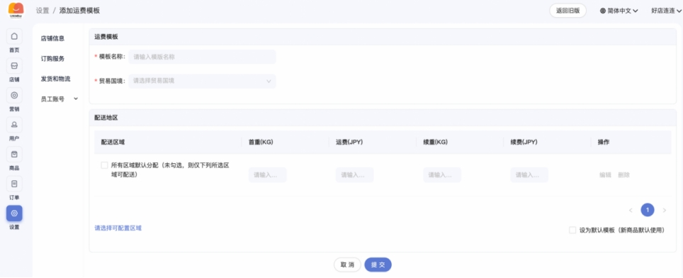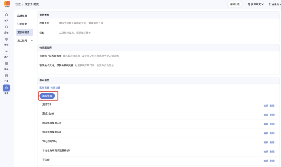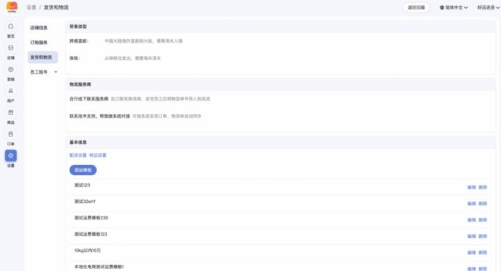 • 运费模板:可添加运费模板,用于商品下单时运费计算