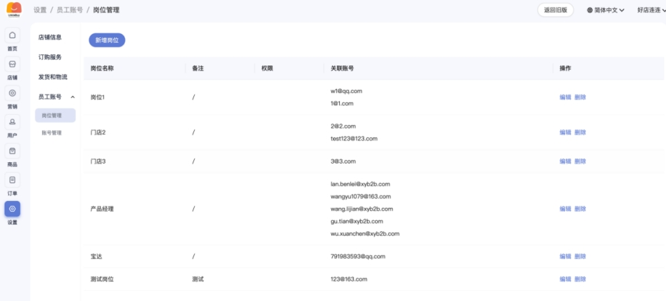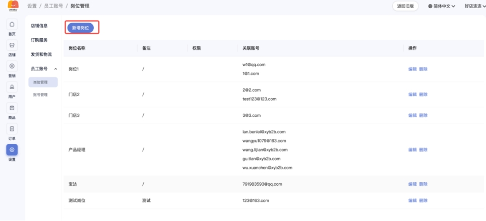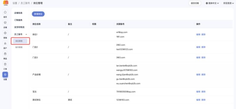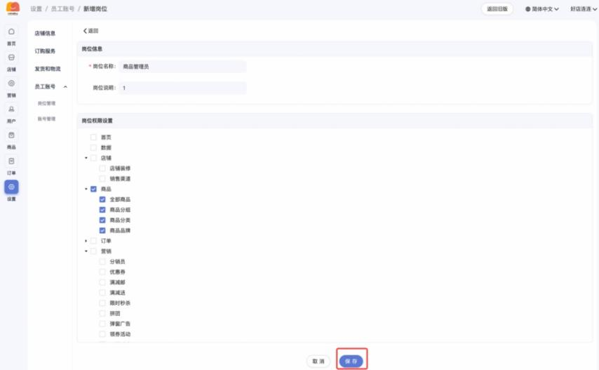 • 先创建岗位:如商品管理员、订单管理员,并为岗位赋予指定的店铺权限;
