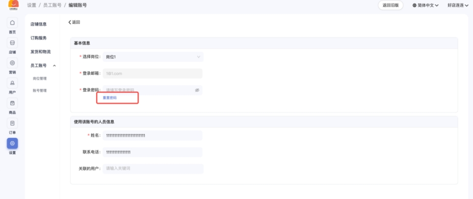 入口:登录后台 - 员工账号 - 账号管理 - 编辑 - 重置密码