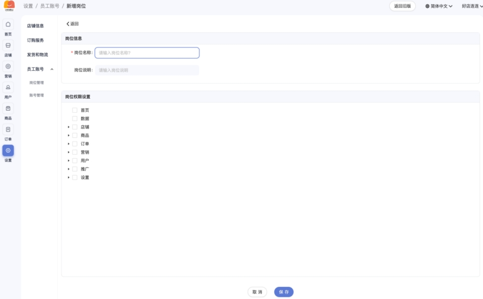 2)填写岗位信息,勾选店铺权限;