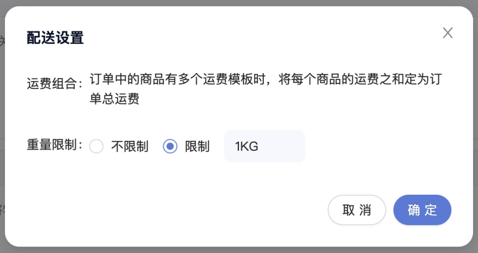 点击“配送设置”,打开设置弹窗,选择是否限制重量,如选择限制,则输入限制重量的数值,以kg为单位。