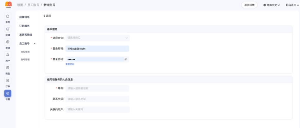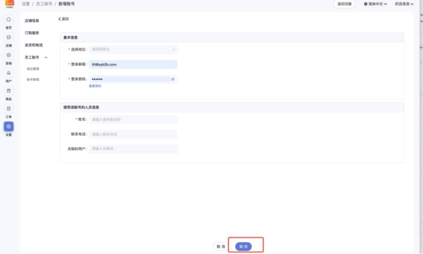 当您的店铺需要多人打理时,可创建员工账号,并为员工设置指定权限。