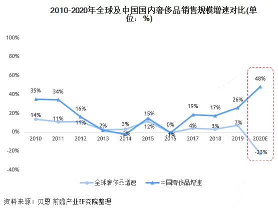 中国境内奢侈品消费市场在经历了2013-2016年的低速增长期,2017年后奢侈品销售回暖显著,2017-2019年市场增速均为全球市场增速的3-5倍。据贝恩2020年初步核算数据显示,全球奢侈品市场销售额在2020年下跌23%,但中国地区全年实现了约48%的增长。