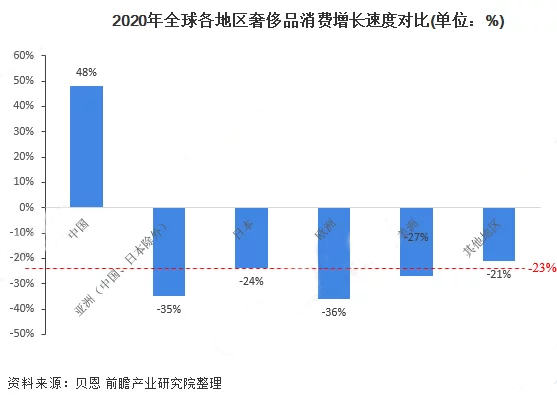 从全球各地区奢侈品消费增速对比来看,除中国内地以外,其他地区消费增速均为负,其中欧洲和亚洲(除中国内地、日本以外)地区下降最为明显,2020年市场分别萎缩36%和35%,下降程度均大于全球整体下滑幅度(23%)。