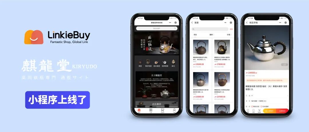 近期,LinkieBuy正式上线了麒龍堂日本铁壶银壶直销小程序商城,这是自麒龍堂与LinkieBuy签订合作协议以来,LinkieBuy助力其线上入华的首步举措。