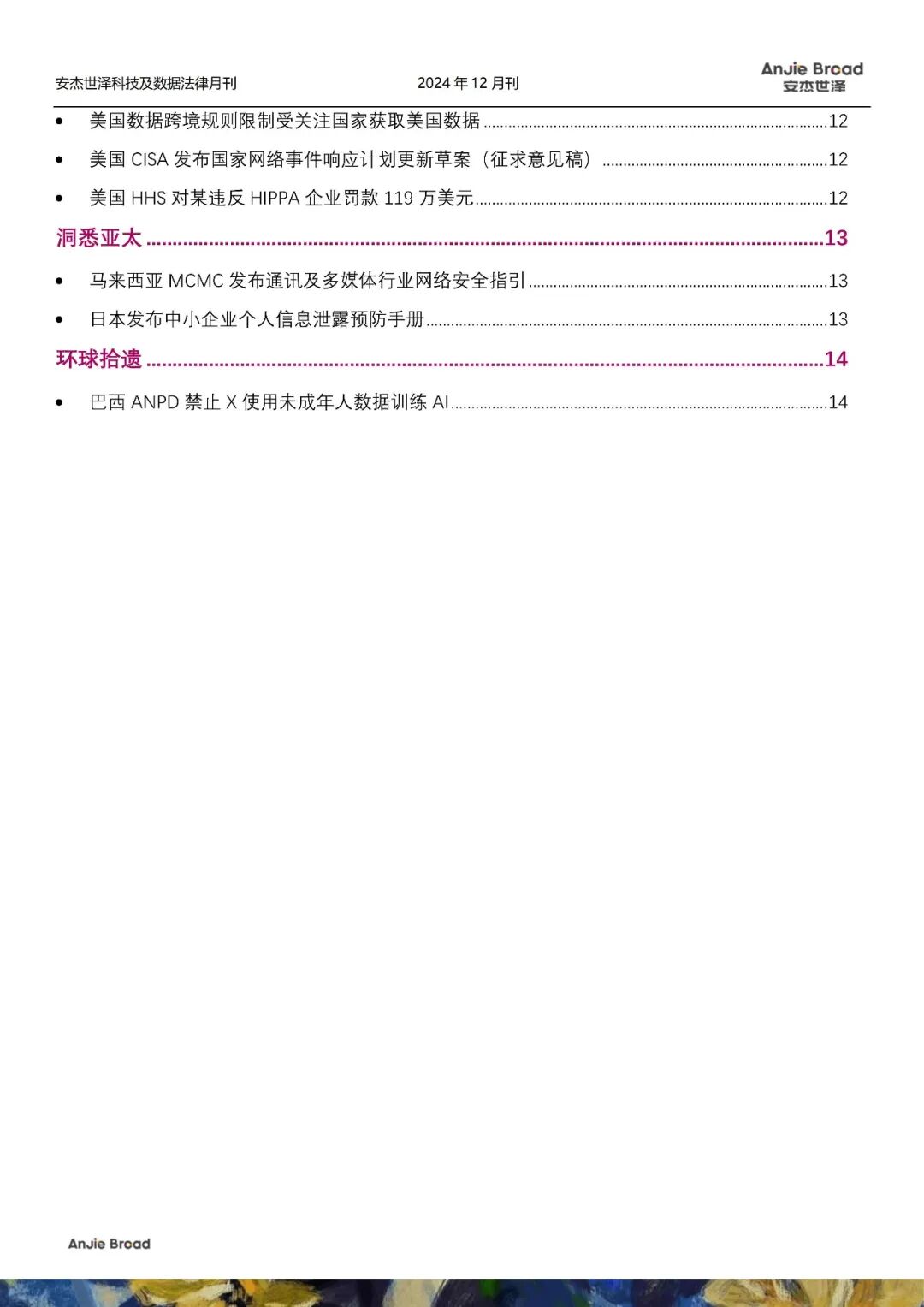 美国司法部发布了《防止受关注国家或涵盖人员访问美国敏感个人数据和政府相关数据的规定》(以下简称“《最终规则》”),该规则旨在严格限制古巴、伊朗、朝鲜、俄罗斯和委内瑞拉等六个特定受关注国家获取美国数据,并明确禁止或限制美国实体与这些国家或相关涵盖人员之间传输大量敏感个人数据或政府相关数据。《最终规则》界定了禁止和限制交易的具体类别,明确了禁止或限制交易分别涉及的数据门槛。同时,该规则还规定了例外的豁免情况,建立了监管部门的许可流程,以授权其他原本被禁止或限制的交易。《最终规则》规定了交易记录的保存和报告要求,以便为司法部的调查、执法和监管工作提供必要的信息支持。《最终规则》已于2025年1月8日刊登于《联邦公报》,并将在刊登后的90天内正式生效。