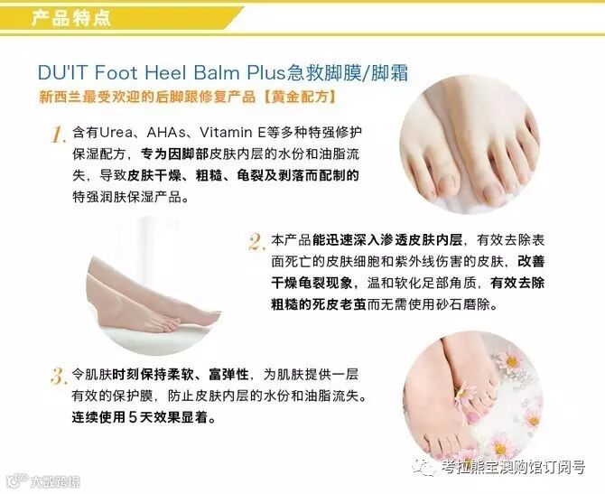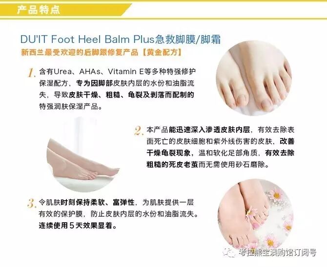 此款Duit急救脚膜保湿滋润的同时不油腻、易吸收,且不含羊毛脂,帕拉胶,石油化工和人工香料,含有UREA、AHAS、VITAMIN等多种特强维护保湿配方,专为因脚部皮肤内层的水份和油脂流失,导致皮肤干燥、粗糙、龟裂及剥落而配制的特强润肤保湿产品。
