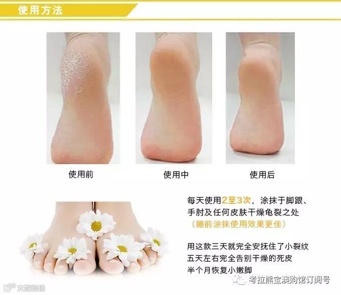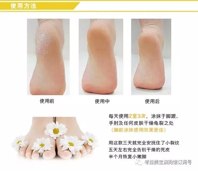 本产品能迅速深入渗透皮肤内层,改善干燥龟裂现象,令肌肤时刻保持柔软、富弹性,同时有效去除粗糙的死皮而无需使用砂石磨除,为肌肤提供一层有效的保护膜,防止皮肤内层的水份和油脂流失。连续使用5天效果显著。