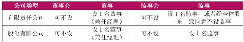 规模较小或股东人数较少的有限责任公司,经全体股东一致同意可以不设监事。规模较小或股东人数较少的股份有限公司,可以不设董事会或监事会,设一名董事及一名监事,突破了原《公司法》对于股份有限公司必须设立董事会及监事会的约束,使小型股份有限公司的治理结构得以大大简化。同时,如果规模较小或股东人数较少的公司设置了董事会,还可以通过设置审计委员会取代公司监事。