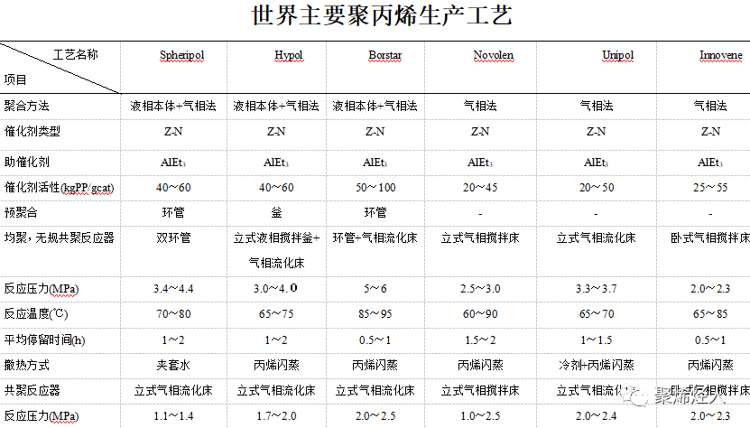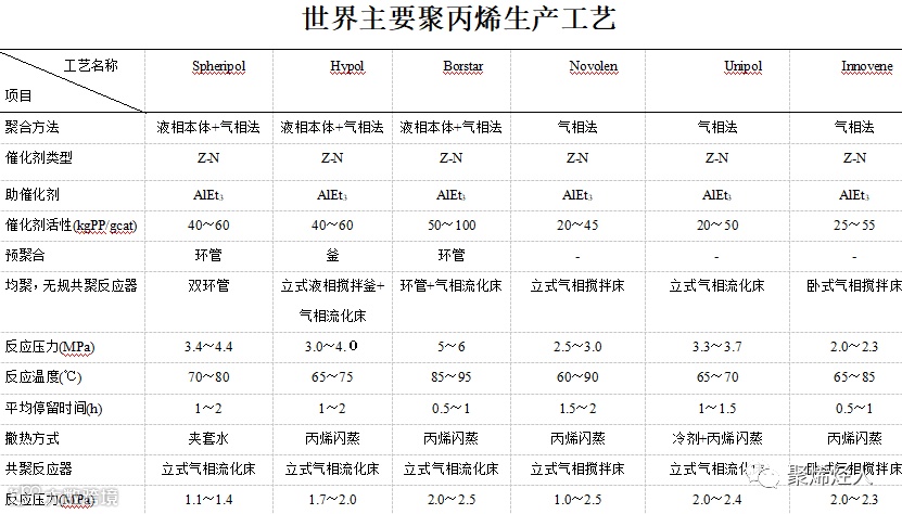 下图为主要的聚丙烯生产工艺,当前主流的聚丙烯生产工艺有本体-气相法和气相法聚丙烯工艺,本体-气相法代表工艺有中石化/LyondellBasell公司的Spheripol工艺和Mitsui公司的Hypol工艺。气相法代表工艺有Ineos公司的Innovene工艺、Grace公司的Unipol工艺、CB&I公司的Novolen工艺、LyondellBasell公司的Spherizone工艺和JPP公司的Horizone工艺等。