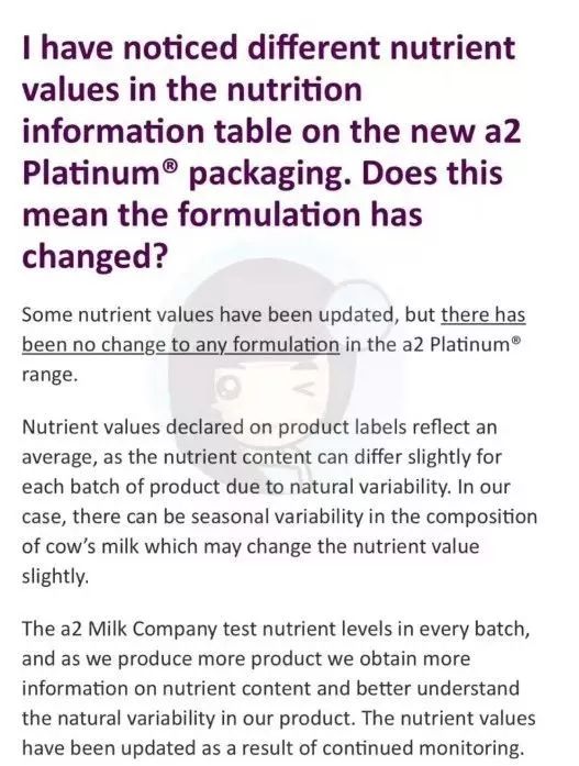 答:如图2,很多代购说话不负责任,也不严谨,A2官方给出了解释,配方变化和营养元素微调2个概念,每批奶粉都会根据A2牛奶的含量进行微量调整