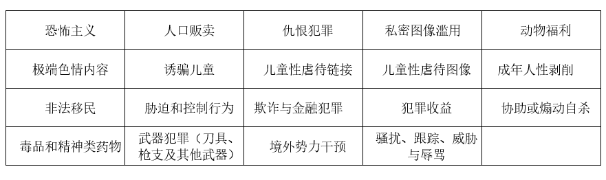 Ofcom认为以下“优先非法危害”必须被纳入非法危害风险评估,详见《非法危害概览》[4]。