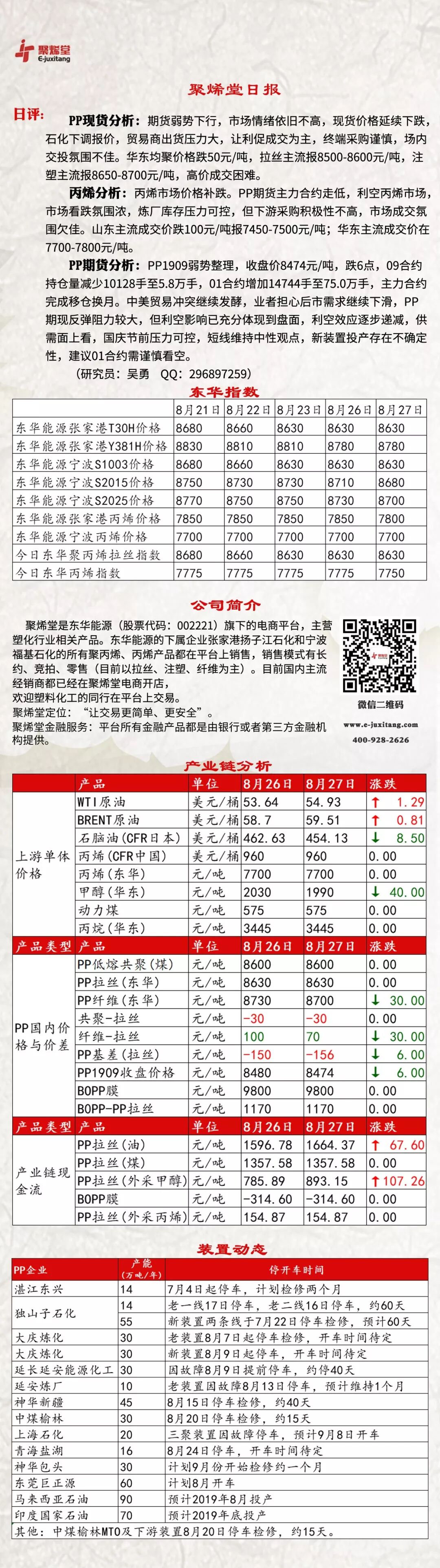 聚烯堂日报【20190827期】PP1909弱势整理,石化下调报价,场内交投氛围不佳。华东拉丝主流报8500-8600元/吨。