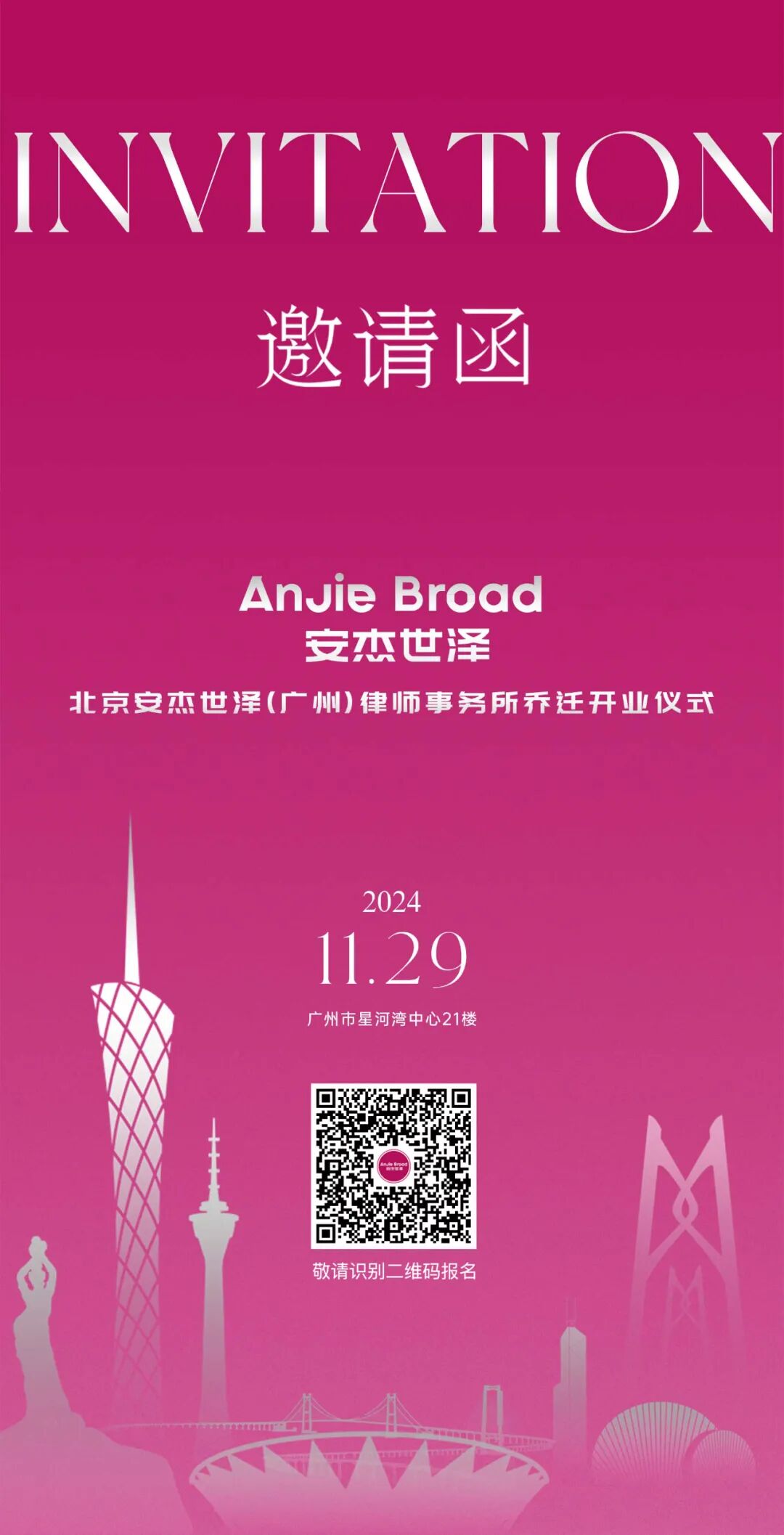 我们诚挚地邀请您参加于2024年11月29日上午10:00在广东省广州市海珠区星河湾中心21楼举办的乔迁仪式,与我们共同见证这一重要时刻。