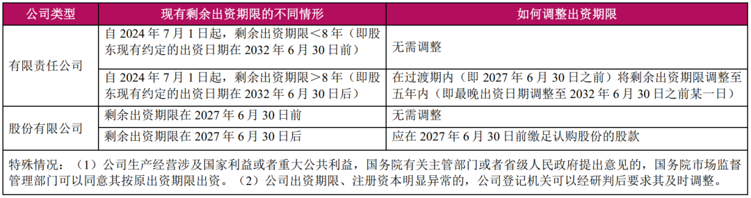 而在新《公司法》施行前已登记设立的公司,同样适用上述出资期限的规定,如果其约定的出资期限超过上述期限的,应当逐步调整至法定期限以内。具体而言,结合《国务院关于实施〈中华人民共和国公司法〉注册资本登记管理制度的规定》所提出的“三年过渡期”安排,存量公司(2024年6月30日前登记设立的公司)可参考下表情形做相应调整: