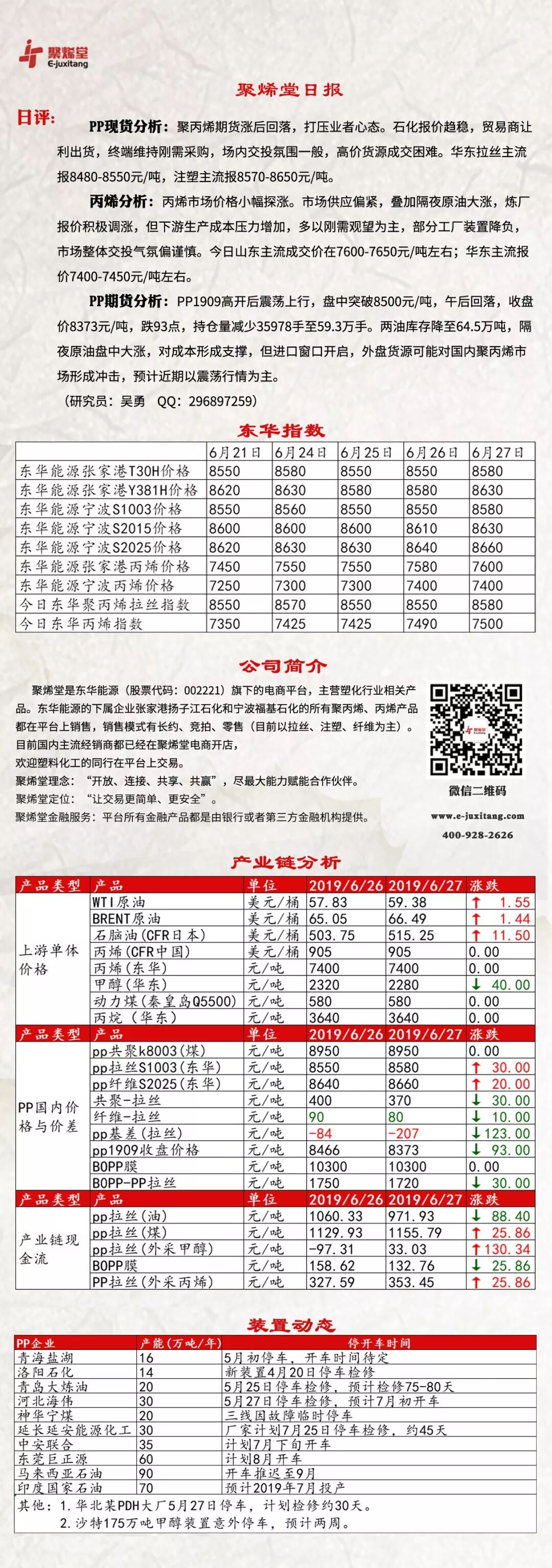 导读:聚烯堂日报【20190627期】今日PP1909高开震荡上行,午后回落。石化报价趋稳。华东拉丝主流报8480-8550元/吨。