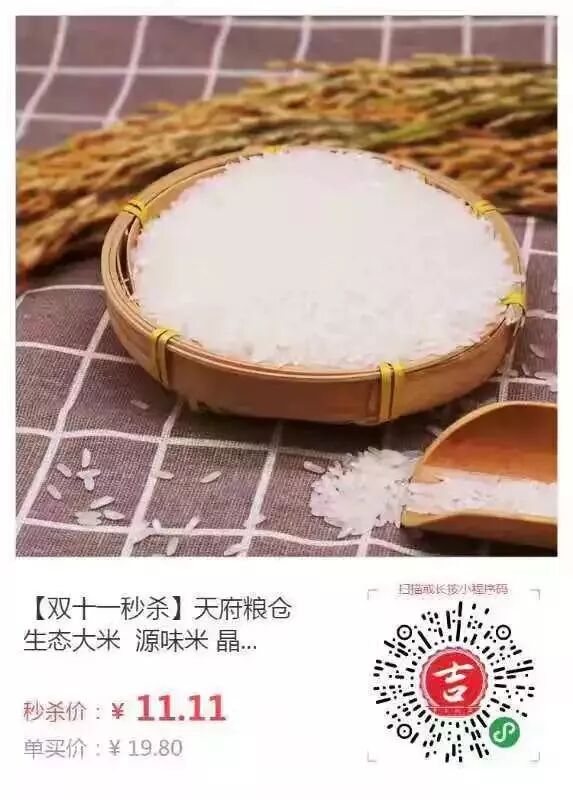 线下促销展台摆放了中通商业自持的生态水稻种植基地产的中通生态大米——源味米,可现场试吃体验,口感香软Q弹,媲美泰香米,营养价值高,与有机大米无二,养生首选,健康、安全、绿色。5KG原价88元,折扣价78元/袋;1KG装原价19.8元双十一期间秒杀11.11元抢购······