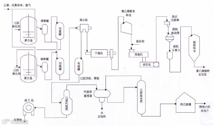 工艺流程可分为并联A、并联B及串联3种生产模式 。反应前,乙烯、丙烯/丁烯、氢气等原料先从反应器底部鼓人反应器的己烷中,开启搅拌以实现原料的充分混合,用己烷将催化剂和助催化剂输送进反应器内,从离心机分离出的母液和冷凝回收的己烷也一并加至反应器。