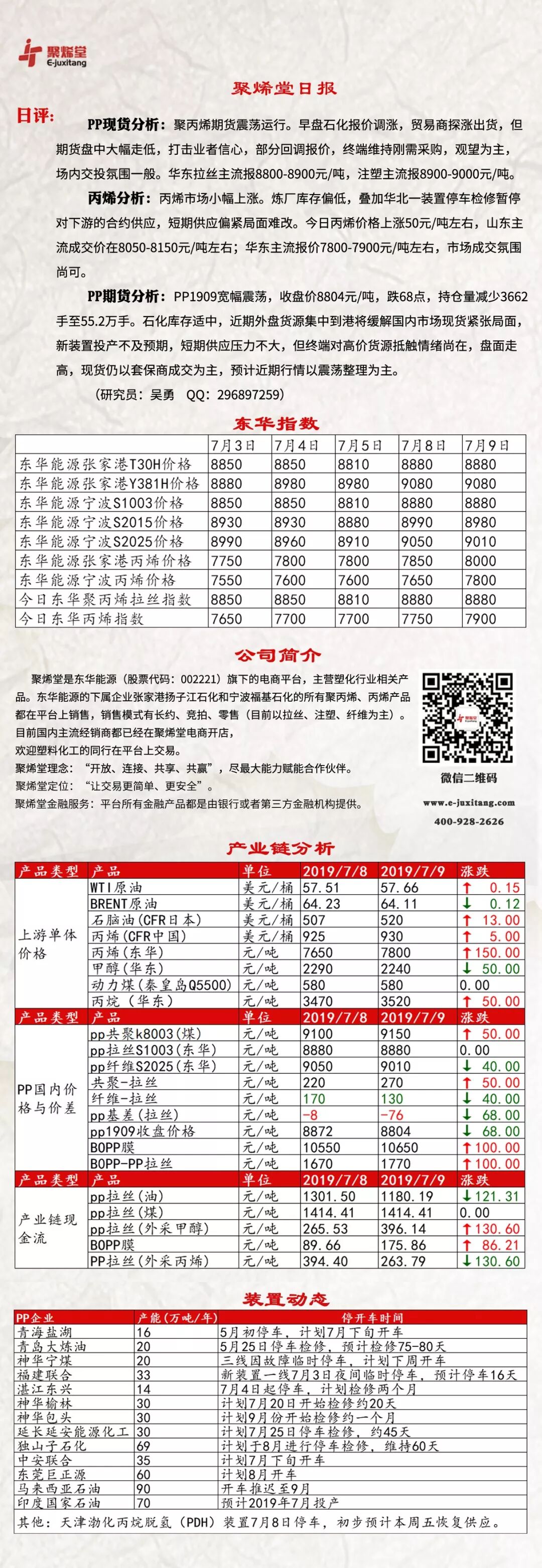 聚烯堂日报【20190709期】今日PP1909宽幅震荡,早盘石化报价调涨。华东拉丝主流报8800-8900元/吨。丙烯小幅上涨