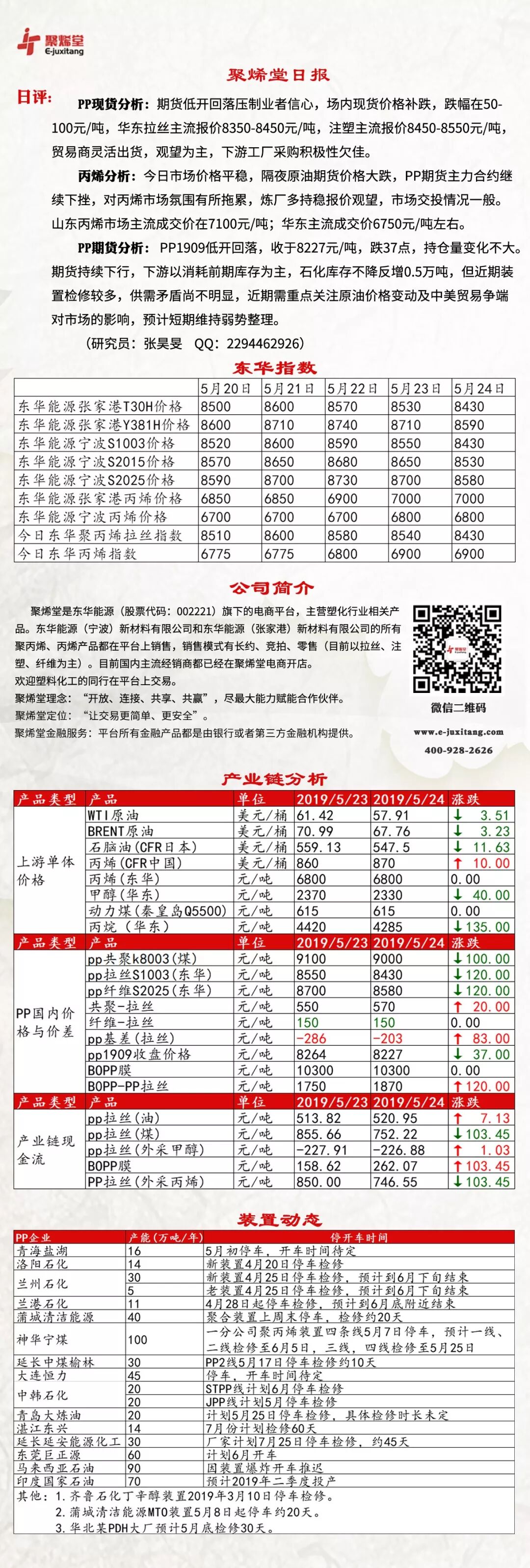聚烯堂日报【20190524期】今日PP1909低开回落,华东拉丝主流报价8350-8450元/吨,贸易商灵活出货,观望为主。