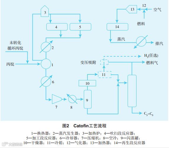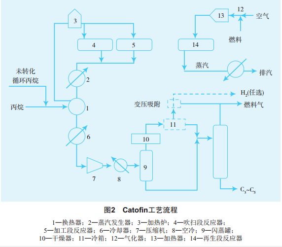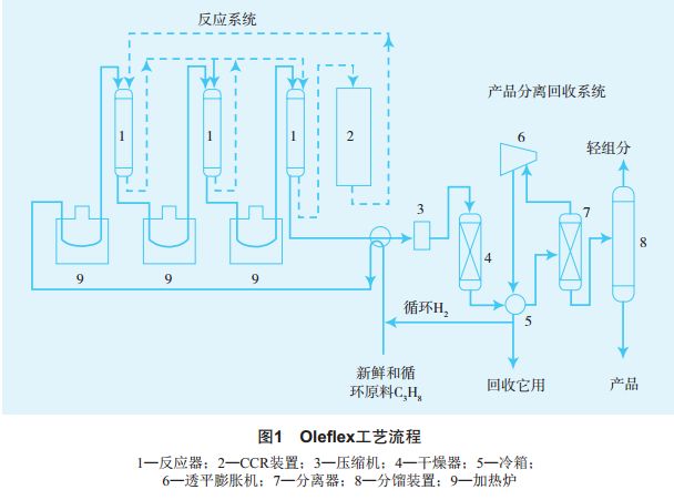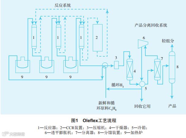 采用循环多反应器系统,很容易添加反应器扩大产能;使用铬-铝非贵金属催化剂,价格便宜,对原材料杂质要求低,无催化剂损失,具有很高的选择性,制备1 kg丙烯产品仅消耗1.15 kg丙烷;操作压力和温度较低,反应中没有用氢再循环和蒸气稀释,可以降低能耗和操作费用;缺点是催化剂反应装置多,且为间歇操作,如进行反应和再生,至少需要两个反应器轮换操作,产品回收部分要加压操作,导致能耗增加。