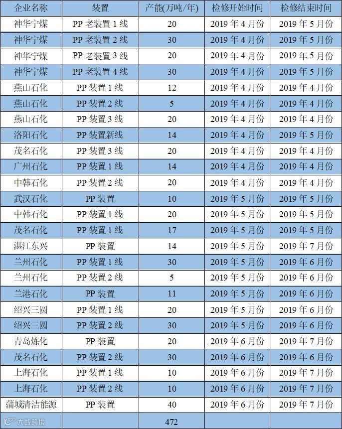 考虑到2019年4-6月,国内PP装置开始进入春检,预计有472万吨的产能被涉及例行检修,这其中不包括部分装置会出现临时检修的情况,因检修而致使产量下降,这将对05合约带来利多影响。
