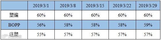 由于税改原因,部分需求前置,致使上周石化企业去库存节奏较快,库存压力由上游向下游传导;同时需要注意的是,税改的影响,部分牌号的进口窗口开始打开,顺挂国内人民币价格,从税改实施的短期看,似乎对需求端带来不利影响。但是从长期来看,税改有利于提高下游的生产积极性,增值税的下调,下游制品工厂的净利润增加,有利于下游制品厂提高开工率。截止3月29号,塑编、BOPP和注塑的开工率分别为60%、59%和57%。后期开工率有望进一步的增加。同时,4-5月份为汽车白电产销上半年的传统旺季,对原料价格将会有一定支撑。