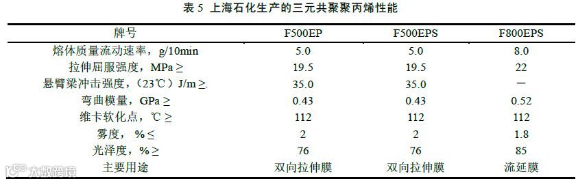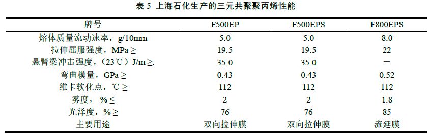 上海石化采用国产双环管工艺,选用DQ催化剂生产三元共聚聚丙烯,上海石化生产的三元共聚聚丙烯性能见表5。