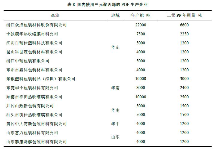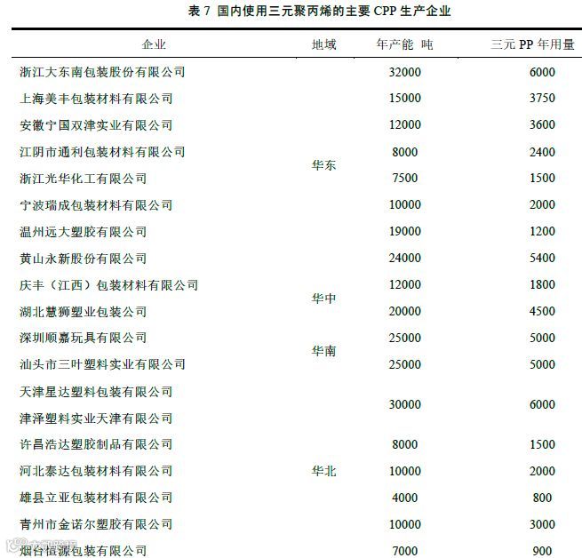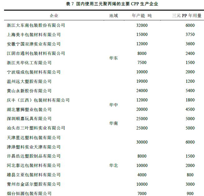 国内主要CPP 生产企业及使用三元PP 的规模详见表7。