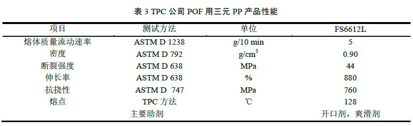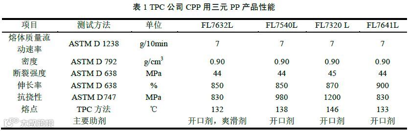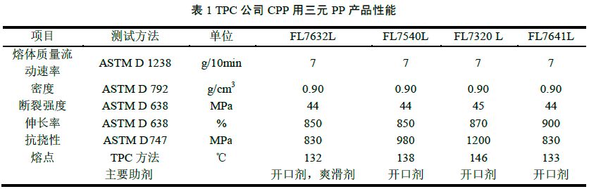 EPP三元发泡主要由韩国LG、新加坡TPC 占有。新加坡TPC 公司的三元共聚聚丙烯FL7320L、FL7632L 主要应用于流延膜复合膜热封层,FL7540L 主要应用于流延膜镀铝层,FL7641L 主要应用于流延膜镀铝膜热封层,产品的性能如表1 所示。