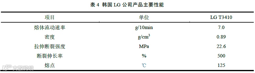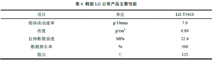 新加坡TPC 公司FS6612L 主要应用于POF热封层,在我国POF 领域占有较大的比重。FS6612L 产品性能如表3 所示。韩国LG 公司的T3410 在EPP 领域得到很好的应用,性能见表4。