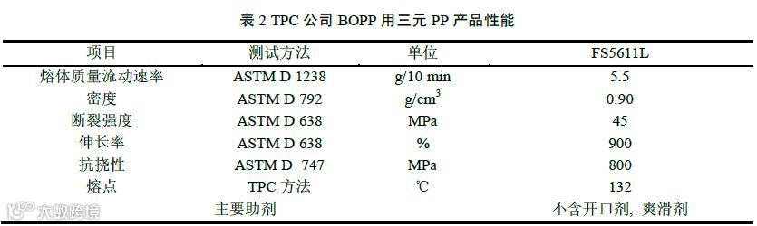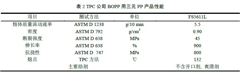 双向拉伸聚丙烯薄膜是包装领域的重要产品,具有质轻、透明、无毒、防潮、机械轻度高等优点,广泛应用于食品、医药、香烟等产品的包装。新加坡TPC 公司FS5611L 中存在较长可结晶链段长度形成的厚晶片,保证了材料的高熔点和强度,主要应用于BOPP 热封层,尤其在烟膜热封层领域占有较大的比重。FS5611L 产品性能如表2 所示。