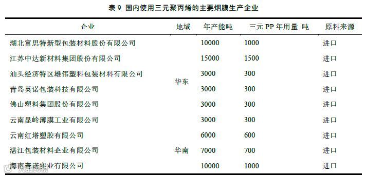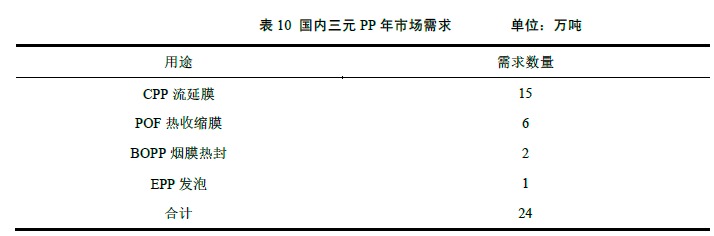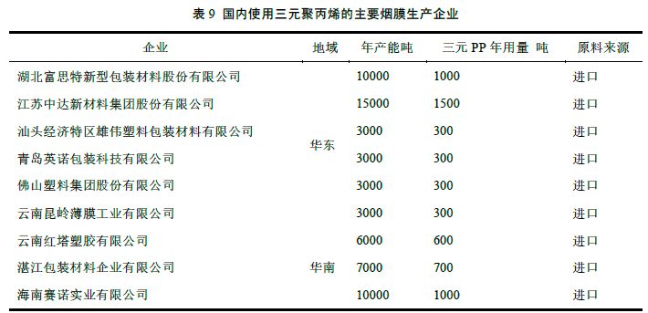 国内烟膜年产量约7 万多吨,三元PP 热封料年需求0.7-1 万吨,国内烟膜生产线全部采用进口设备(德国布鲁克纳),单线投资在1 亿元以上,设备投入大,市场需求稳定,主要选用新加坡三元PP 产品。三元聚丙烯发泡(EPP)产品,由于其生产技术难度高,只有少数国家的少数大公司能够生产,我国年用量在2-3 万吨。