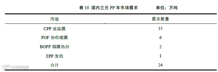 多层共挤流延膜一般可分为热封层、支撑层、电晕层等三层,其中热封层要进行热封合加工,要求材料的熔点较低,热熔性要好,热封温度要宽,封口要容易,只有三元无规共聚聚丙烯能够满足这几方面的要求,流延膜也是国内三元无规共聚聚丙烯料用量最大的应用领域,2014年三元PP消费量11万吨。