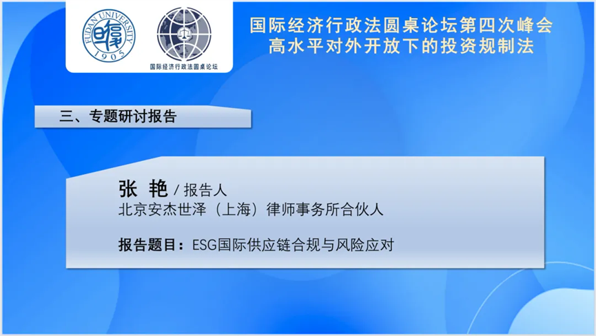 在峰会专题研讨报告环节,张艳律师以“ESG国际供应链合规与风险应对”为题进行了专题报告。