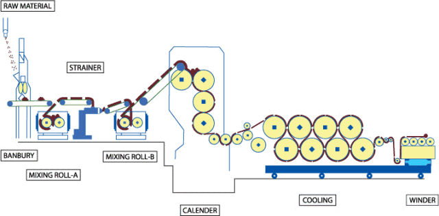又称压光。重革整理的最后一道工序。利用纤维在混热条件下的可塑性将织物表面轧平或轧出平行的细密斜线,以增进织物光泽的整理过程。材料被送入之后,加热并熔化,然后成形为片或膜,然后冷却并卷起。最常用压延材料是聚氯乙烯。