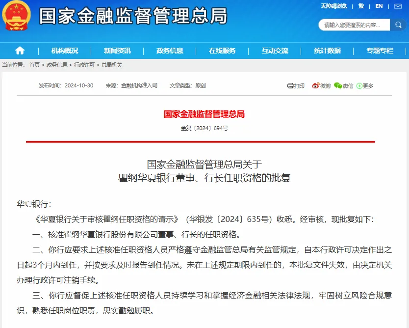 10月28日,国家金融监督管理总局已核准瞿纲担任公司执行董事、行长的任职资格。瞿纲的任期自2024年10月28日起正式生效,将持续至公司第八届董事会届满之日止。