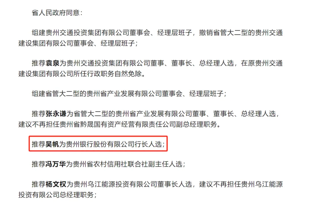 10月30日,微信公众号“贵州省人民政府网”发布多家省管国企高管人员的职务调整通知。其中,贵州省人民政府同意推荐吴帆为贵州银行行长人选。