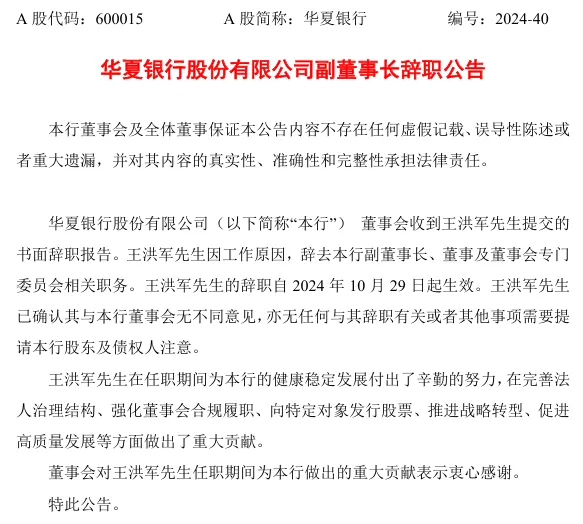 10月31日,华夏银行发布公告,王洪军先生因工作原因,辞去本行副董事长、董事及董事会专门委员会相关职务。王洪军先生的辞职自2024年10月29日起生效。