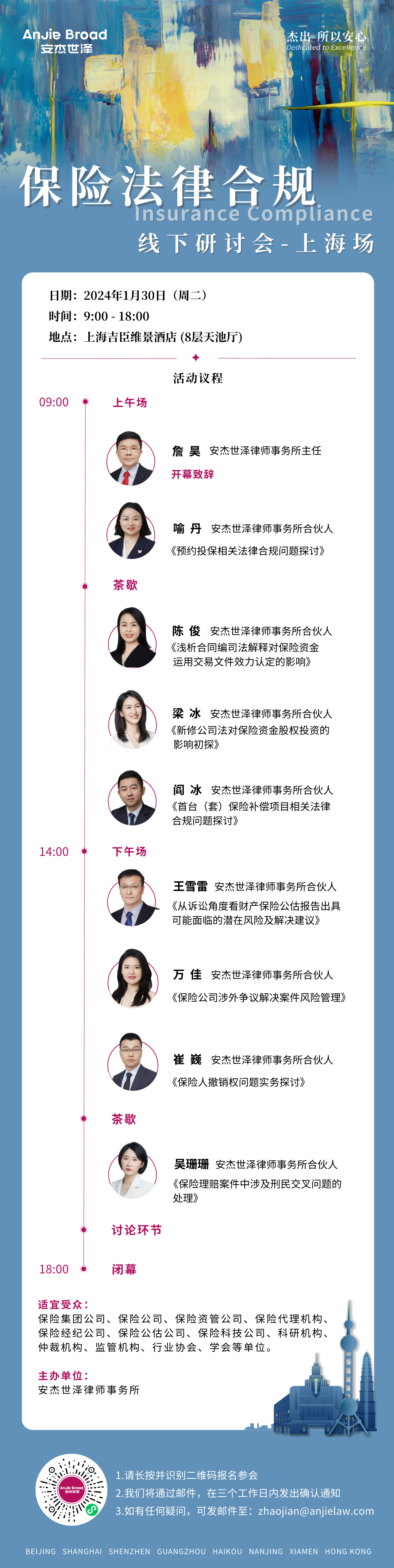 就保险合规管理与风险控制中的监管动态与对策以及保险诉讼与仲裁案件中出现的疑难热点问题,安杰世泽律师事务所将于上海举办2024年度保险业务第一次线下研讨会,期待与广大保险业界同仁进行深入的探讨及交流。。